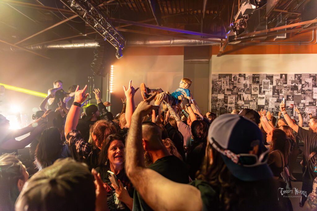 Midway through the chaos, Daniel paused to interact with the crowd and noticed two kids up front. “How old are you?” he asked. “10!” they shouted. Without missing a beat, he grinned and roared, “These two are giving more than 100% up here!” The crowd erupted — and the band fed off that energy for the rest of the set.